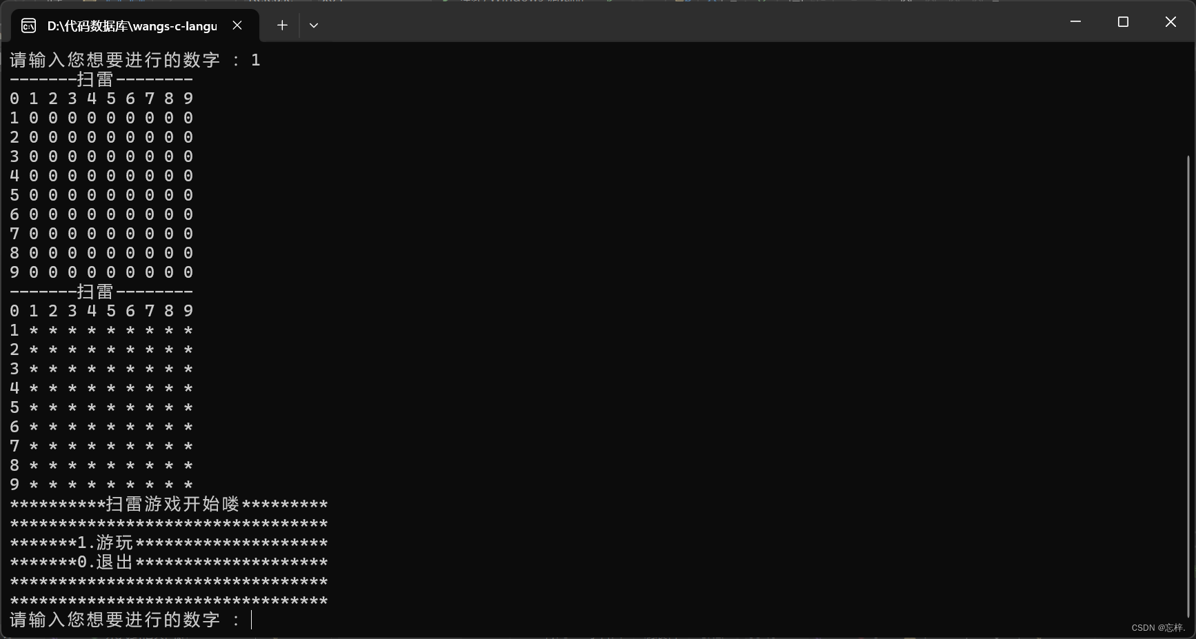 我把代码分成了三份分成写,所以我就不用代码分别展示了不然显的不好看,第一个是代码的主题内容,第二个是主函数内对函数的调用,第三个是头文件对函数的声明,为了让棋盘代码写的数量减少,我在函数不仅仅有数组和行列,还加上了想把棋盘变成的内容,就比如我们因为还没设置雷,所以先用‘0’代替,棋盘的主体用‘*’表示,这样可以让代码的可读性和灵活性上升,减少代码量与文件的大小,下面来看看棋盘的效果 ,对了我缺少了打印的部分,下面附上