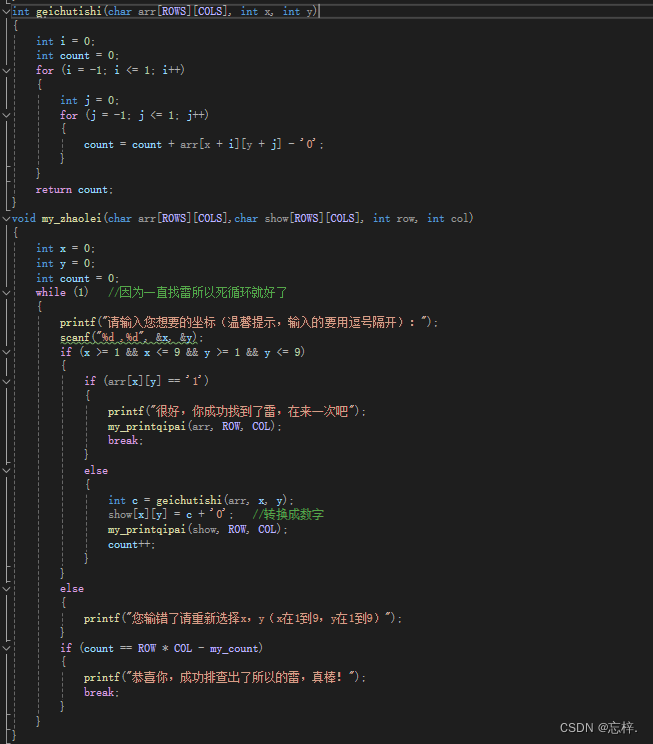 对于雷的寻找,我们可以采用通过坐标的方式来进行排查类,这个时候就用到了循环的知识了,通过一直循环来进行排查雷,直到雷找到或者找完了才停止循环,具体的代码就放到了下面: