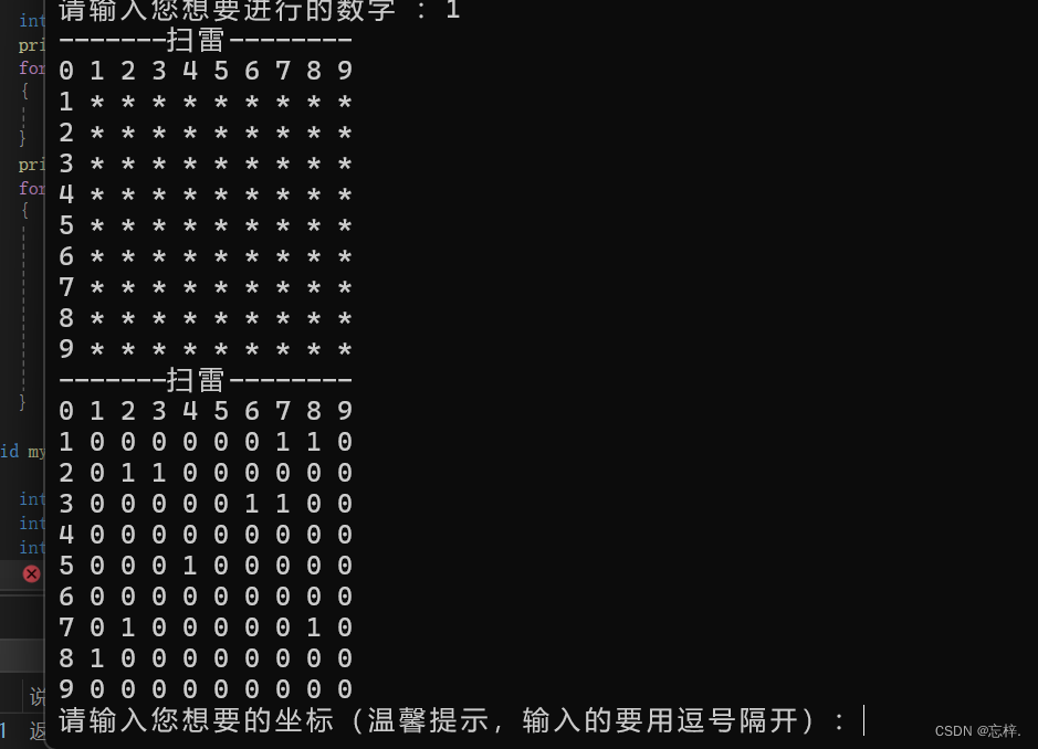 这个算是扫雷游戏最好实现的部分了,仅仅通过printf仅可实现,下面是代码的实现: