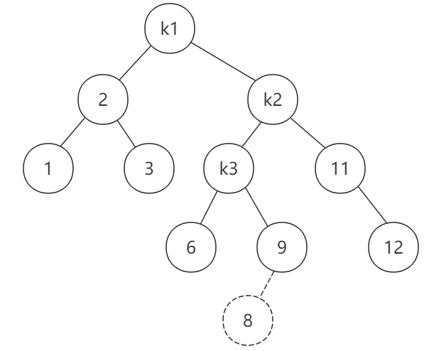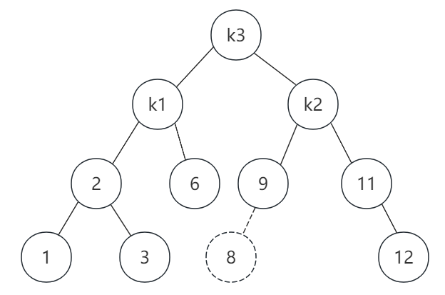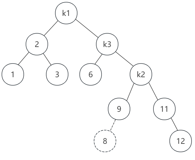 插入节点8后,导致k1节点的右子树高度比左子树高度大于1,同时k2的左子树比右子树高,这就是右-左情形。这时,我们需要先在k2节点做一次左旋转,旋转后如图: