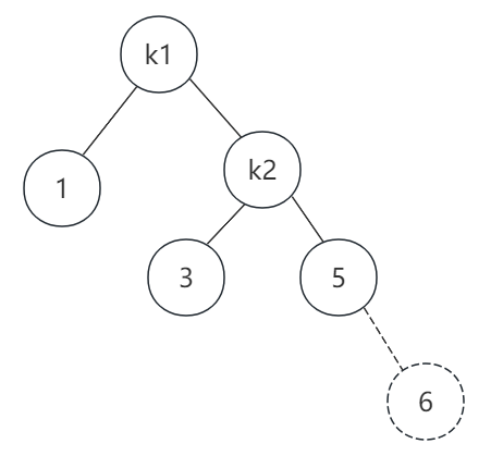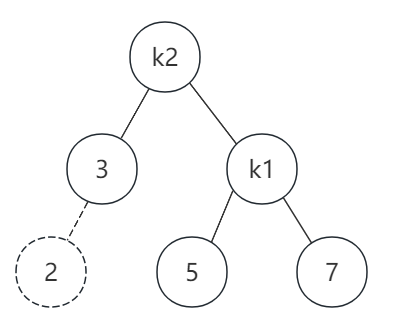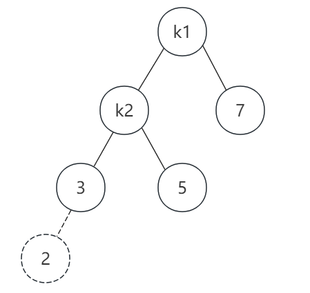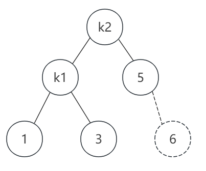 由于左子树的高度比较高,所以我们要将树旋转一下,用k2作根节点,k1作为k2的右子节点,旋转后如图所示:
