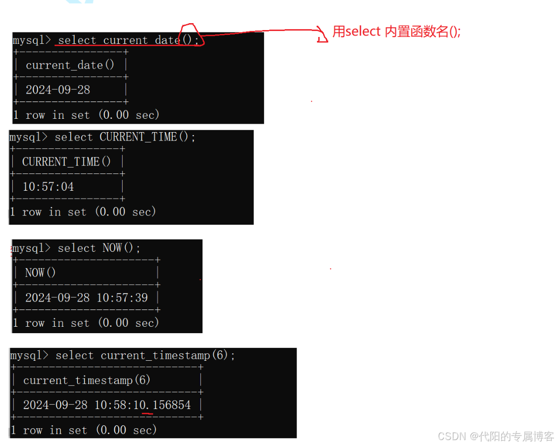 • CURRENT_DATE 和 CURRENT_DATE() 是 CURDATE() 的同义词⽤于获取当前⽇期 | |||