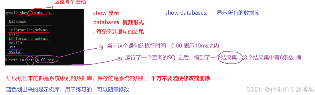 语法: show databases; 注意:databases是复数 大小写不敏感 注意分号结尾