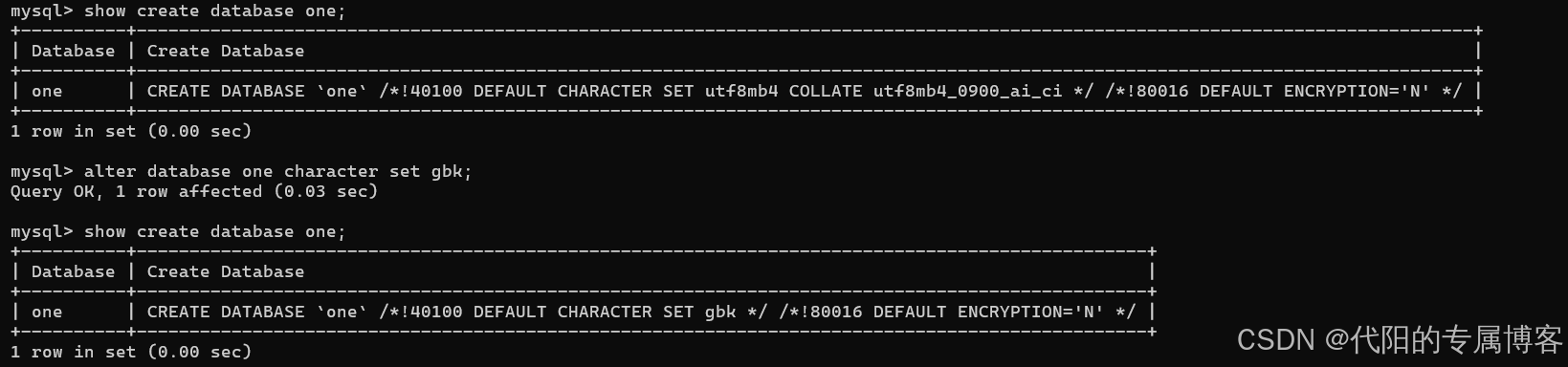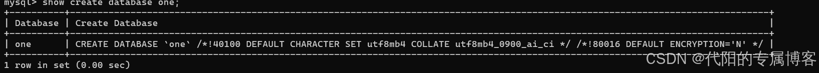 create database if not exists one character set utf8mb4 collate utf8mb4_0900_ai_ci;show create database db_name;