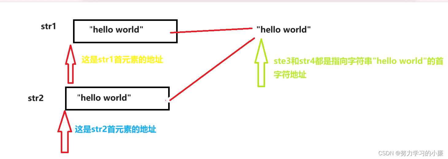 看到这里可能会感到疑惑str1和str2都是数组名,代表首元素的地,址不都是存放'h'的地址吗,怎么不一样呢?