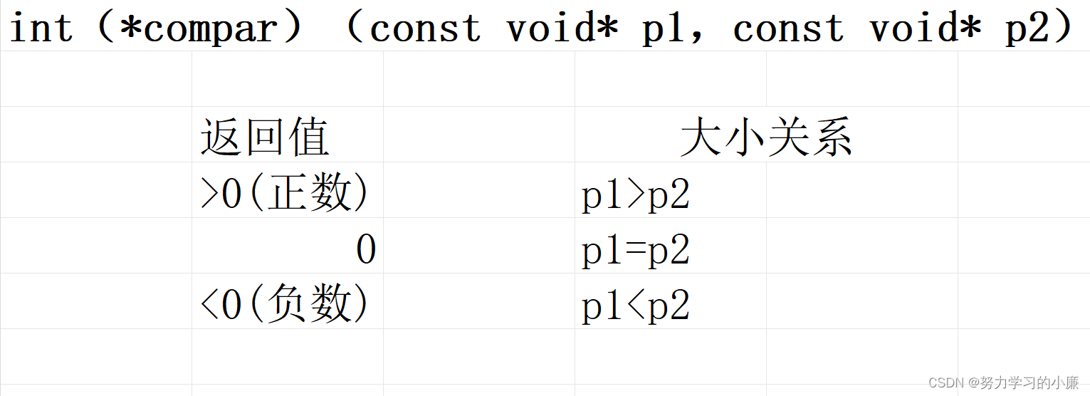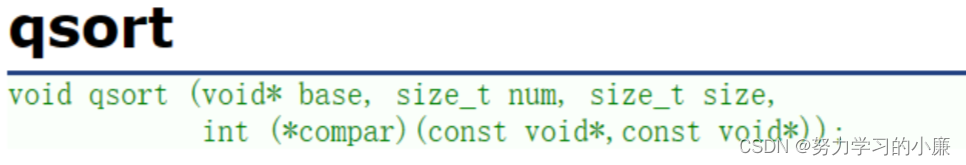 其中,base表示需要排序数组的地址;num表示数组中的元素个数;size表示数组中存放的元素的大小,单位是字节;int(*compar)(const void*,const void*)是函数指针,(指针指向的是判断大小的函数,返回值要求