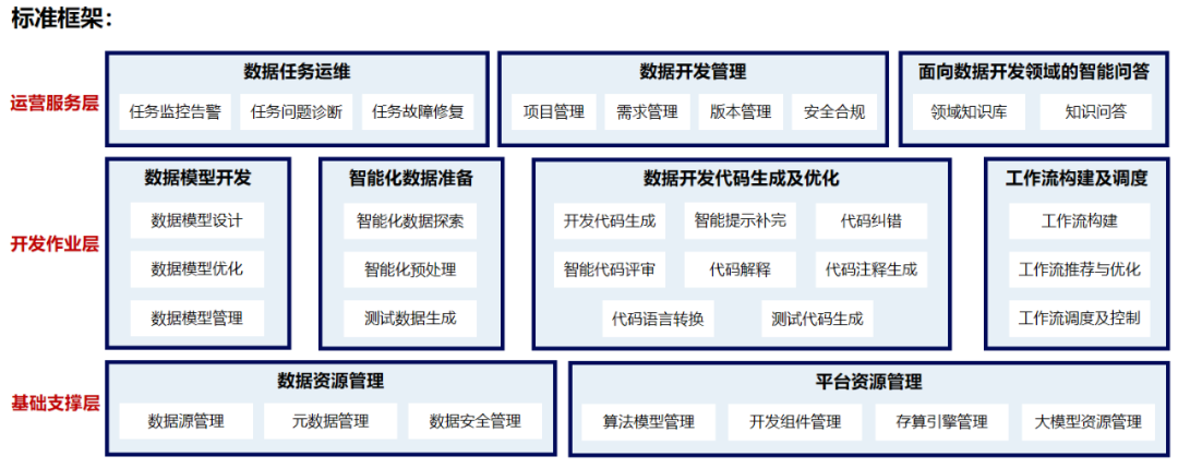 为推动大模型在数据开发领域的应用,中国信通院云计算与大数据研究所依托中国通信标准化协会大数据技术标准推进委员会(CCSA TC601),联合腾讯云等40余家企业共同参与起草,充分参考各行业数据开发实践经验,编制完成了《大模型驱动的智能数据开发平台技术要求》标准,包含数据资源管理能力、平台资源管理能力、数据模型开发能力、智能化数据准备能力、数据开发代码生成及优化能力、工作流构建及调度能力、数据任务运维能力、数据开发管理能力、面向数据开发领域的智能问答能力等九大能力域,共 33个能力项,90余条能力细则。