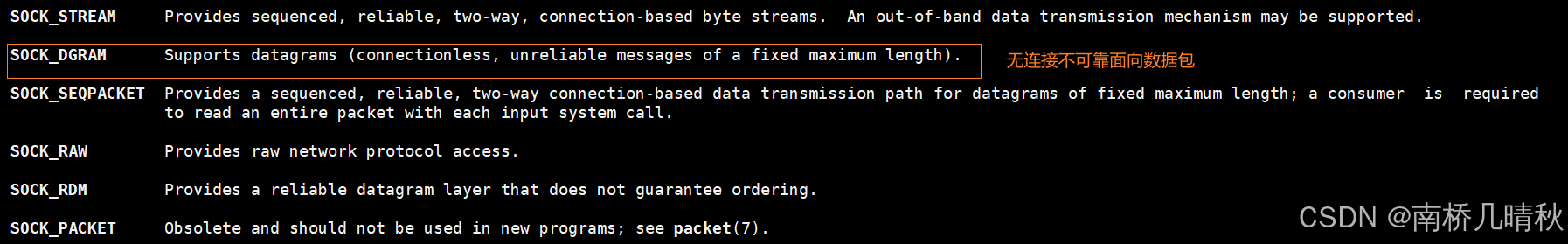 SOCK_DGRAM: 提供不可靠的、无连接的数据报(UDP)