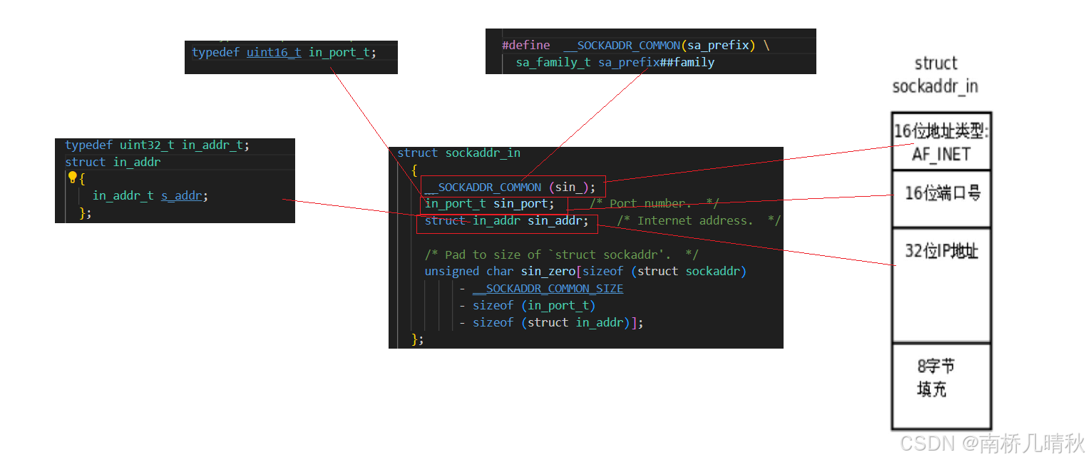 struct sockaddr_in local;结构体用于存储本地地址信息,该对象中有四个字段,如下:
