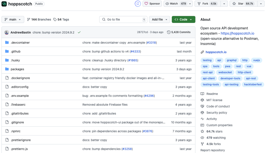 Hoppscotch 自开源至今,收获了众多开发者和互联网研发团队的喜欢,发布有54个Release版本,并且一直持续更新迭代中,在GitHub上Star数更创新高:64.7k。