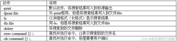 -exec …… {}\; | 后面可跟用于进一步处理搜索结果的命令 |