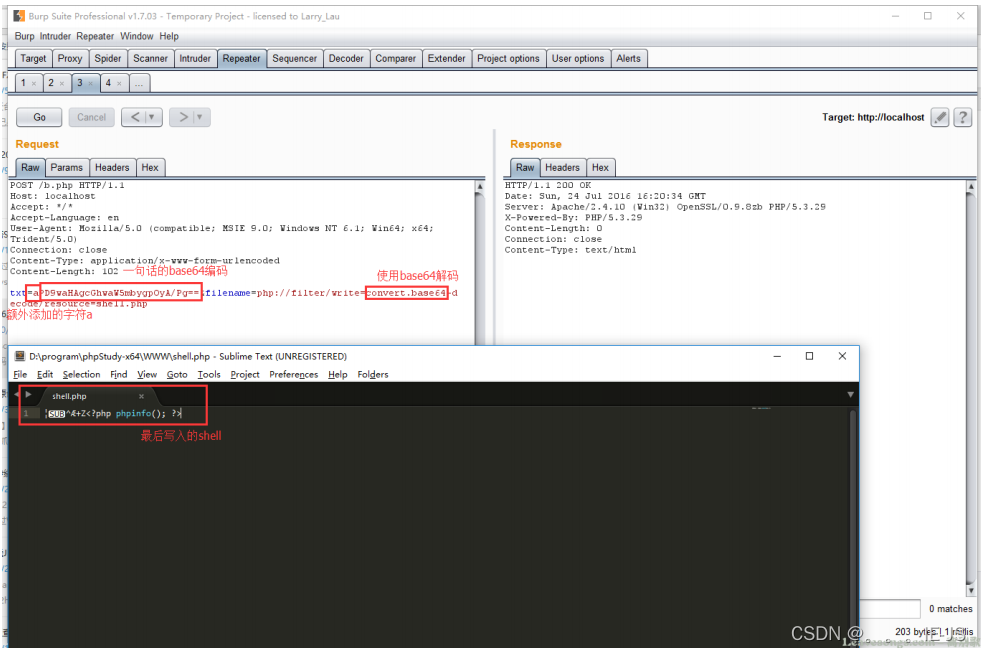 “phpexit”一共7个字符,因为base64算法解码时是4个byte一组,所以给他增加1个“a”一共8个字符。这样,"phpexita"被正常解码,而后面我们传入的webshell的base64内容也被正常解码。结果就是<?php exit; ?>没有了。