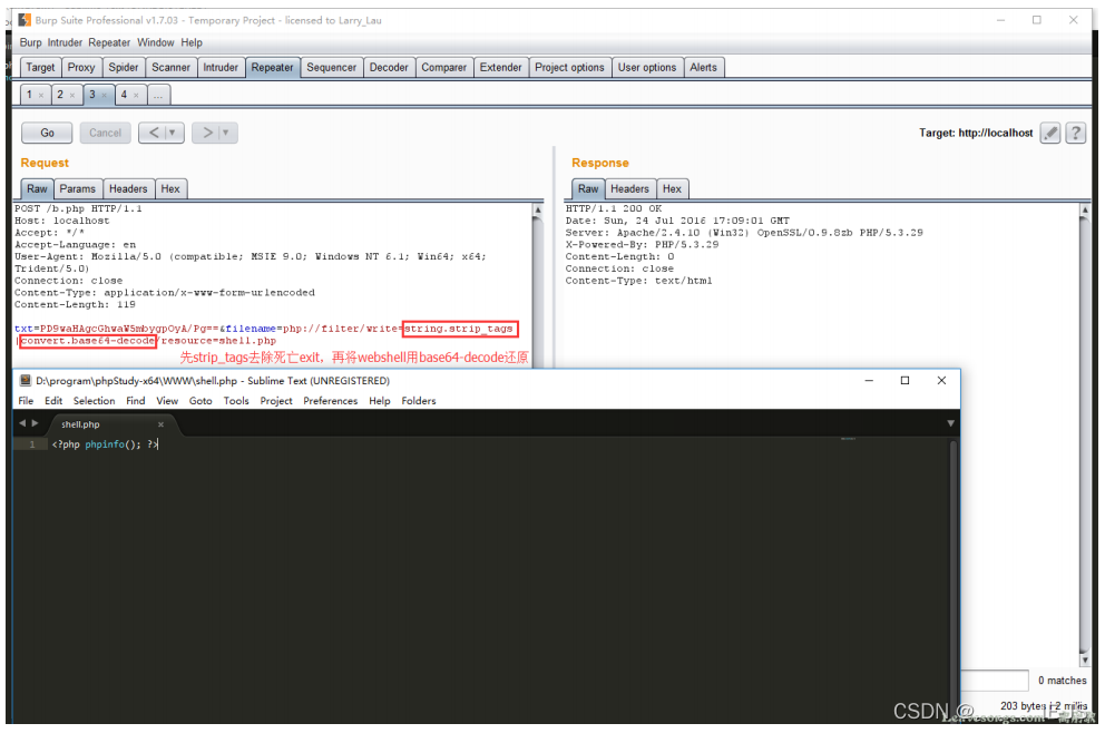 万幸的是,php://filter允许使用多个过滤器,我们可以先将webshell用base64编码。在调用完成strip_tags后再进行base64-decode。“死亡exit”在第一步被去除,而webshell在第二步被还原。