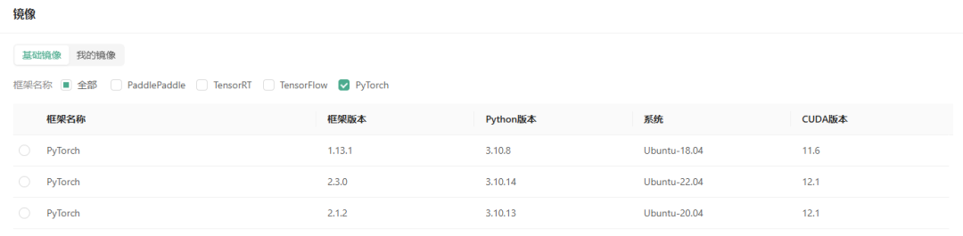 接下来选择镜像,目前主流平台的框架都是支持的,选择Pytorch,就可以看到Pytorch的镜像信息。