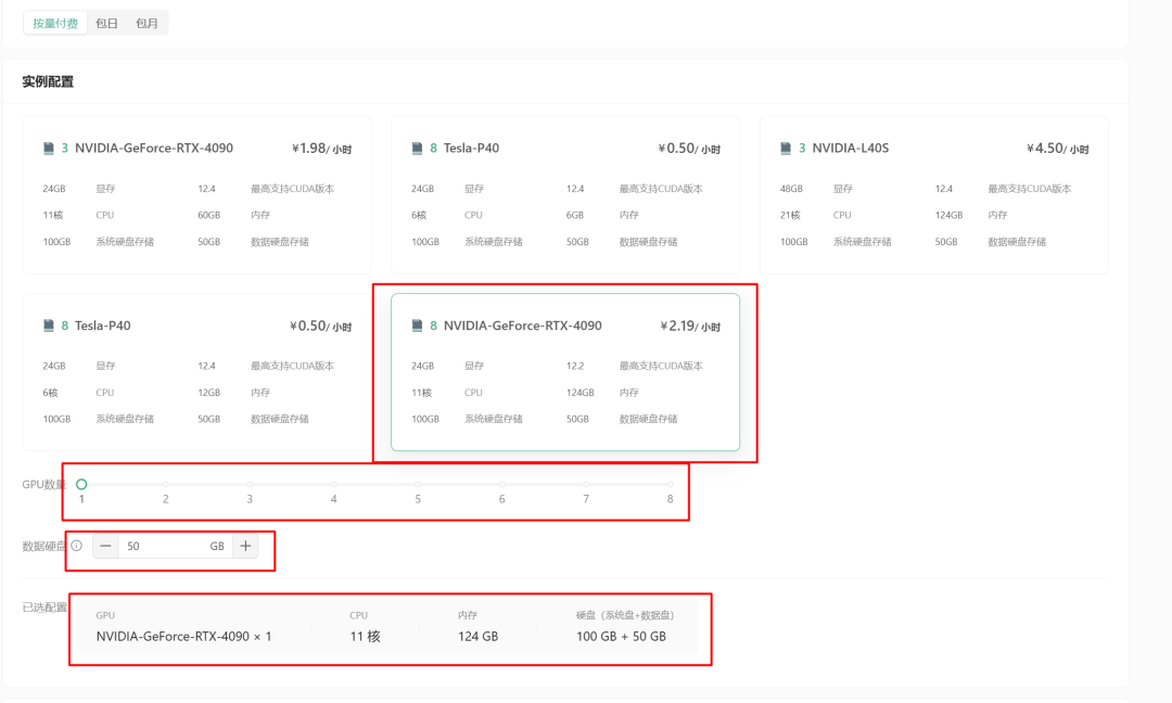 RTX 4090 | 24 | 60 | 11 | 100G系统盘50G数据盘 | 性价比配置,推荐入门用户选择,适合模型推理场景 |