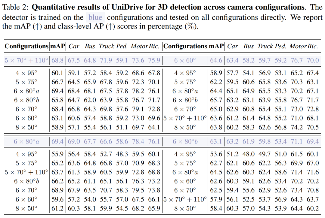 - 评估了BEVFusion-C和UniDrive在不同相机配置下的3D目标检测性能。