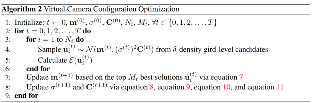 - 优化虚拟相机配置:使用基于协方差矩阵自适应进化策略(CMA-ES)的优化方法,来寻找一个优化的虚拟相机配置集合,以最小化所有原始相机配置之间的重投影误差。
