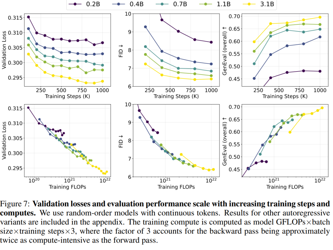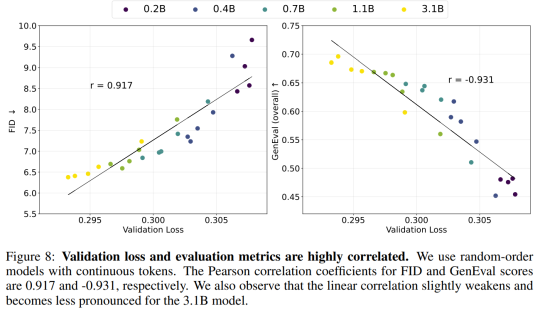 - 验证损失随着模型规模的增加而降低,与语言模型中的观察结果一致。但FID和GenEval得分与模型规模的关系并非严格的幂律关系。