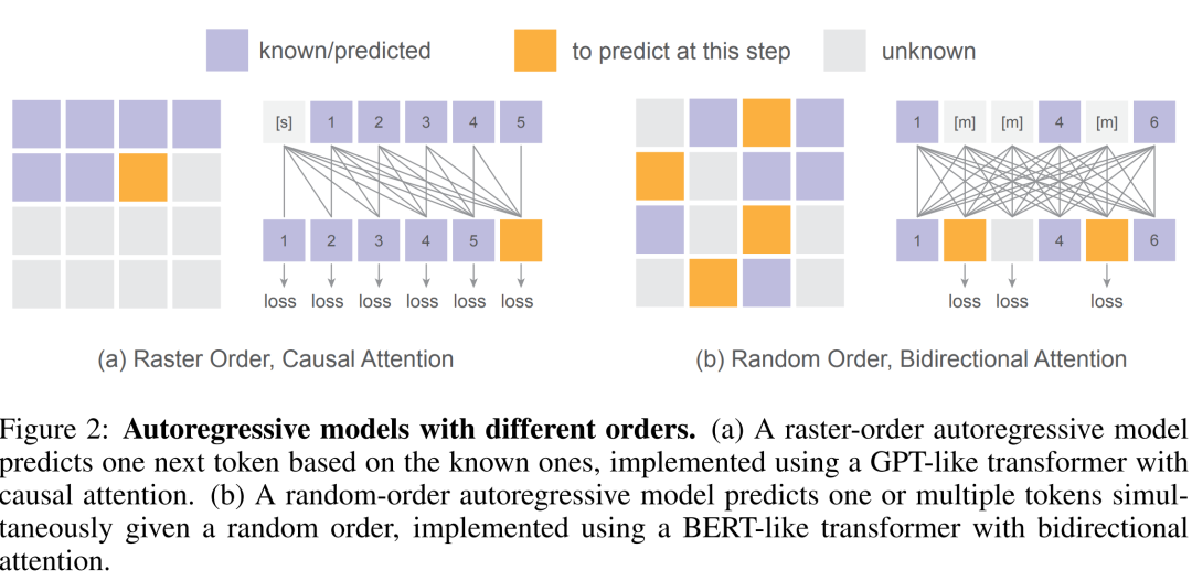 - 标记生成顺序:自回归模型在生成图像时,可以采用固定的光栅顺序(从左到右,从上到下)或随机顺序。论文探讨了这两种生成顺序对模型性能的影响。
