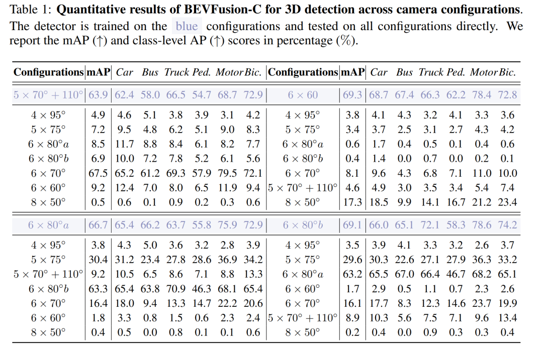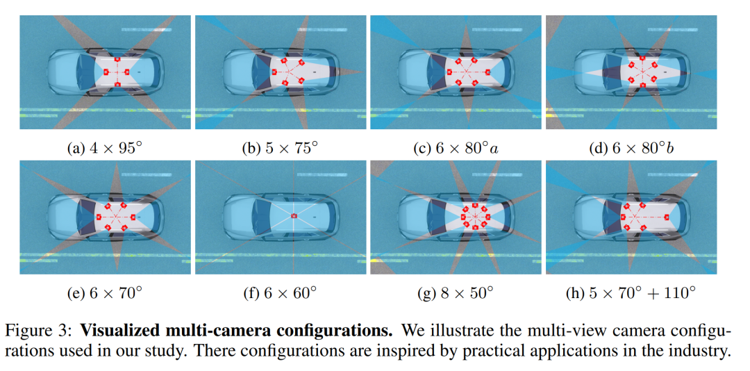 - 配置包括从4到8个相机,FOV主要为60°、70°、80°,同时包括nuScenes数据集的原始配置。