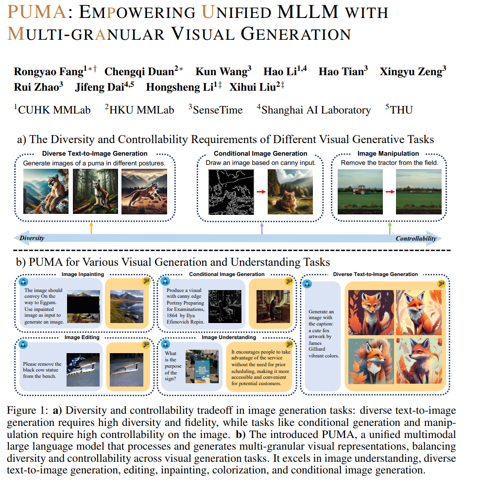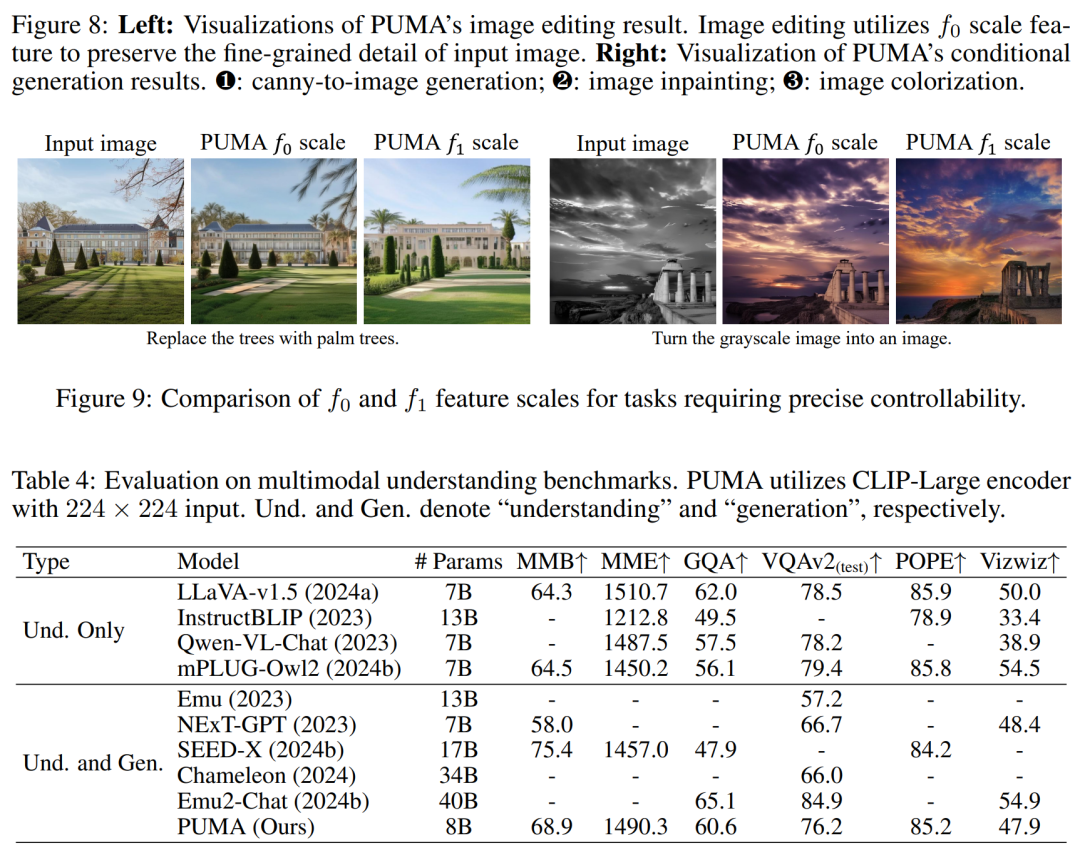 - 多模态任务:PUMA在多种多模态任务中表现出色,包括图像理解、文本到图像生成、编辑、修复、着色和条件图像生成。
