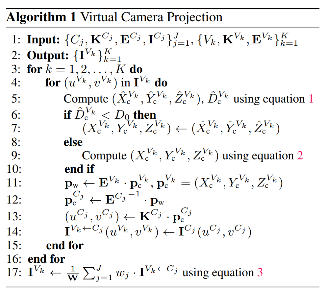 - 虚拟相机投影:提出了一种将多个相机视图上的点投影到虚拟相机视图的方法。这涉及到计算每个像素在虚拟视图中的3D坐标,然后将其转换到世界坐标系中,接着转换回原始相机坐标系,并最终投影回原始相机的2D图像平面。
