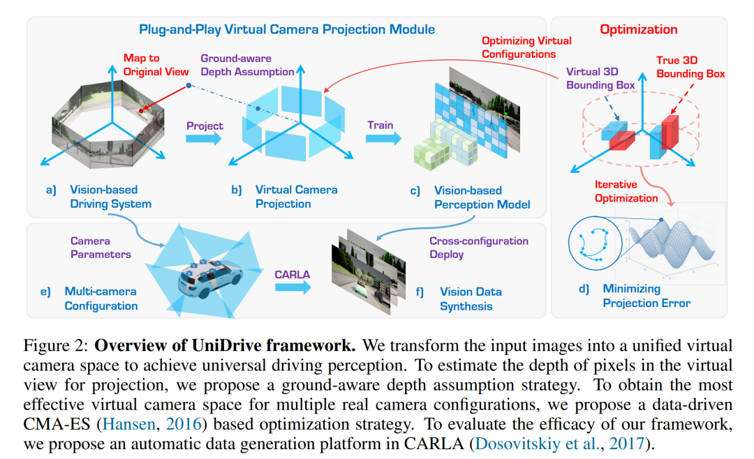 为了解决这些问题,论文提出了一个名为UniDrive的框架,它通过部署一组统一的虚拟相机空间,并利用基于地面感知的投影方法,将原始相机图像转换为这些统一的虚拟视图。此外,论文还提出了一种虚拟配置优化策略,通过最小化原始相机和虚拟相机之间的预期投影误差,实现跨不同设置的一致3D感知。该框架作为现有3D感知方法的即插即用模块,提高了对相机参数变化的鲁棒性。