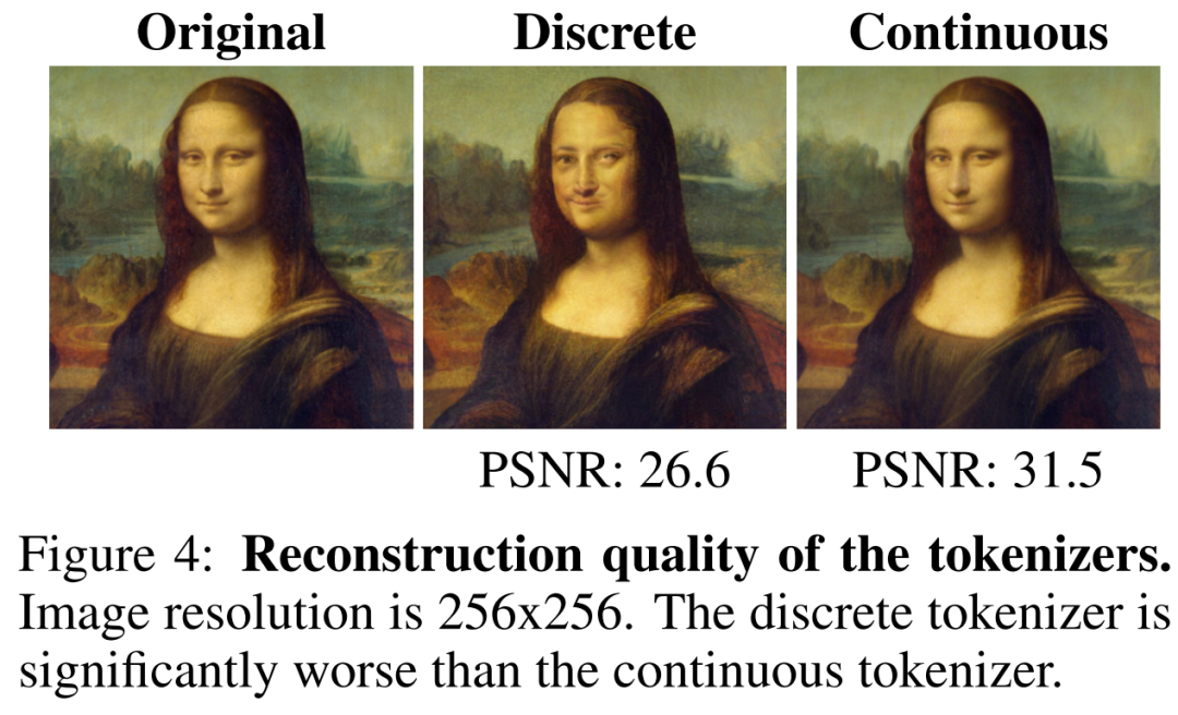 - 连续标记的模型在视觉质量上明显优于离散标记模型。