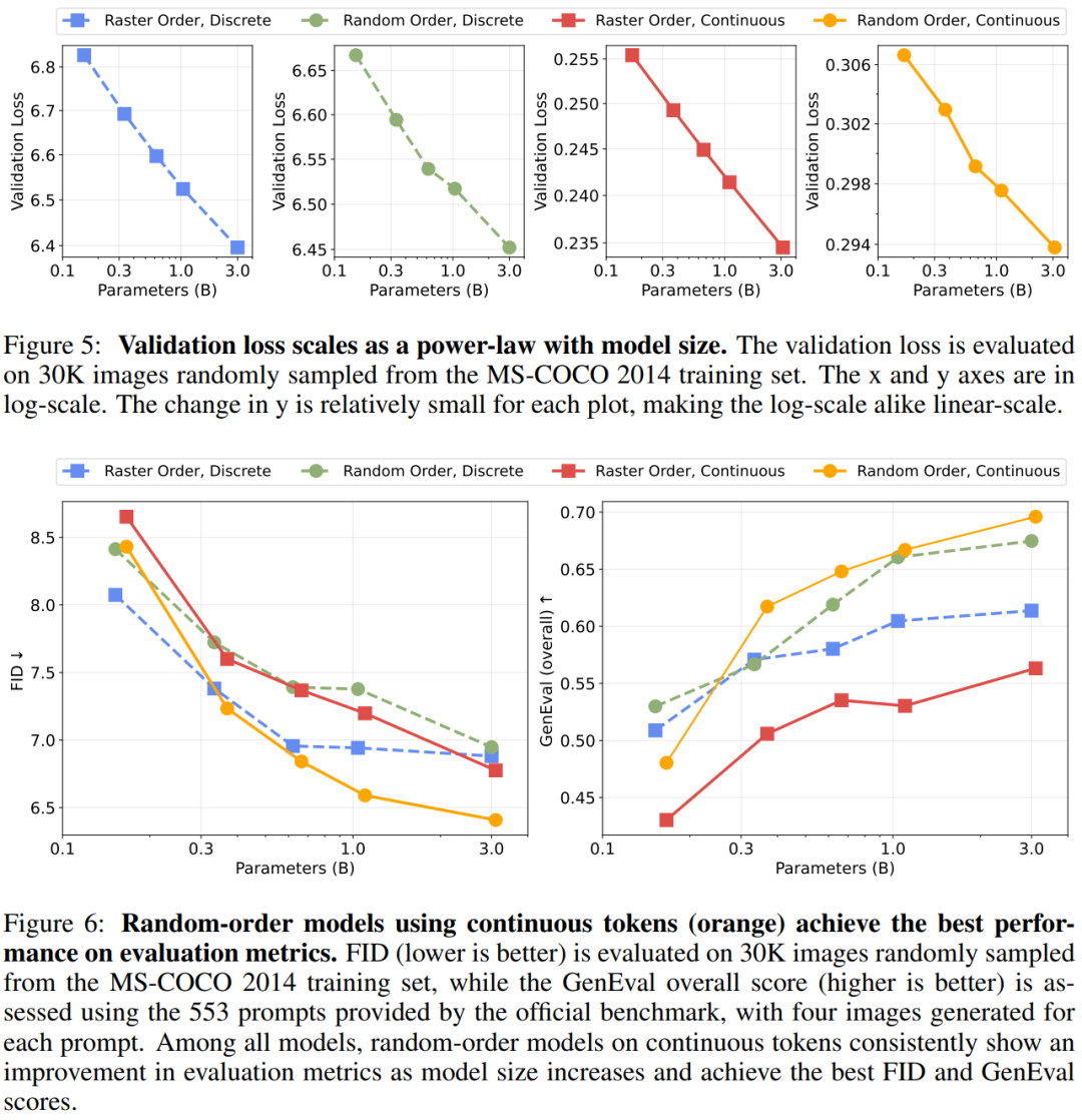 - 经验发现:实验结果表明,基于连续标记的模型在视觉质量上明显优于使用离散标记的模型。此外,随机顺序模型在GenEval得分上显著优于光栅顺序模型,特别是在生成多个对象时。