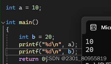 结果输出a的值是20,这说明如果在一个函数体内,全局变量如果和局部变量名相同,则会优先使用局部变量。