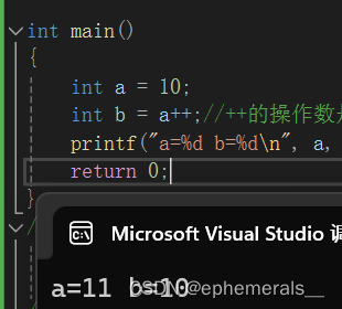 这就是前置++的效果:首先定义a的值是10,之后先将a自增1,a此时的值是11,之后将a的值赋值给b,b的值就是11。
