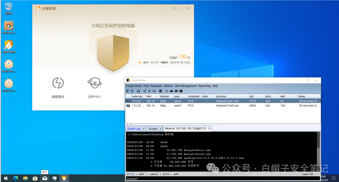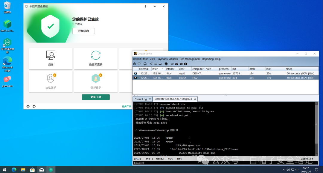 先把反虚拟机段代码注释下, 切到不同的windows10虚拟机快照上,惊奇的发现我们免杀了Defender, 火绒,卡巴斯基,至于360,那就随它去吧!