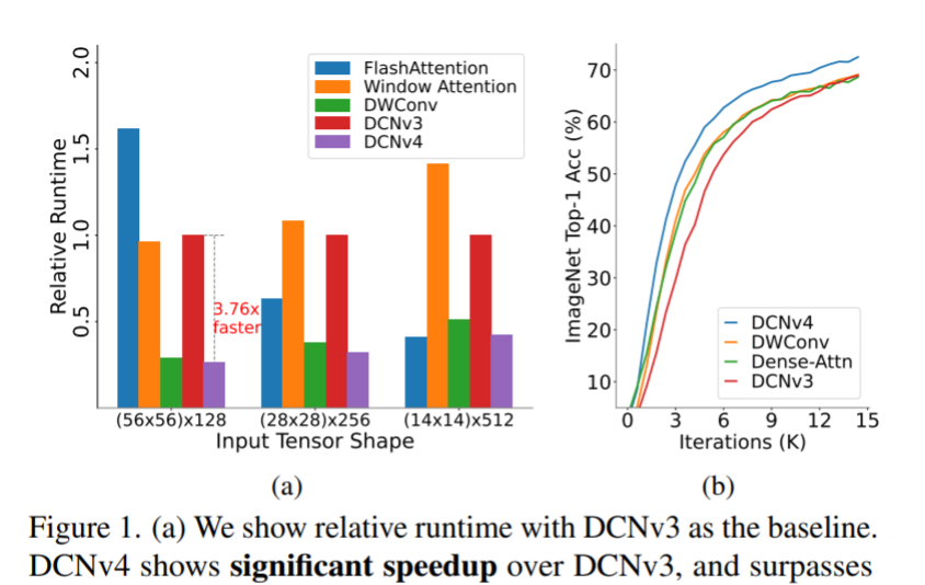 图1所示。(a)我们以DCNv3为基准显示相对运行时间。DCNv4比DCNv3有明显的加速,并且超过了其他常见的视觉算子。(b)在相同的网络架构下,DCNv4收敛速度快于其他视觉算子,而DCNv3在初始训练阶段落后于视觉算子。
