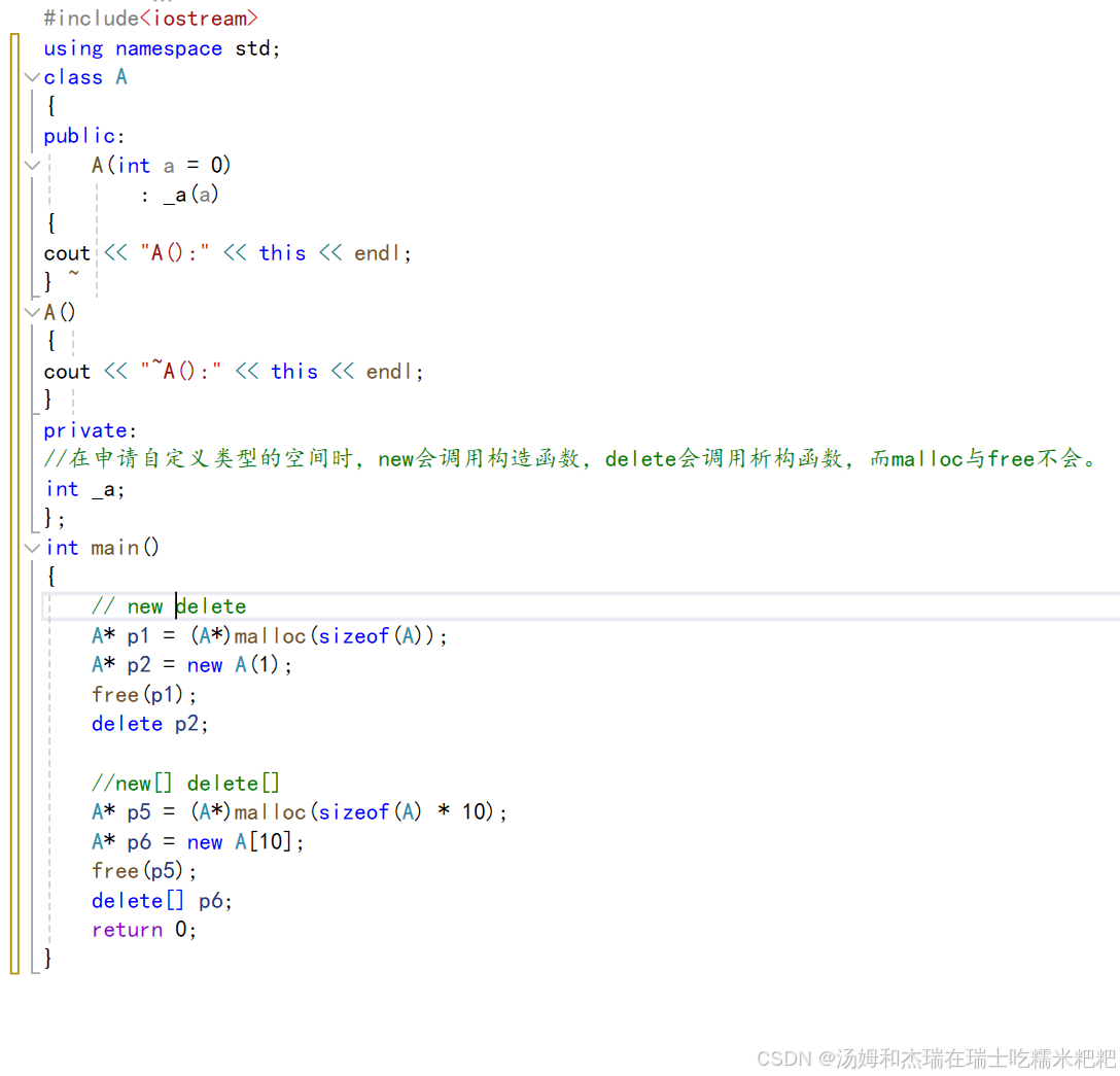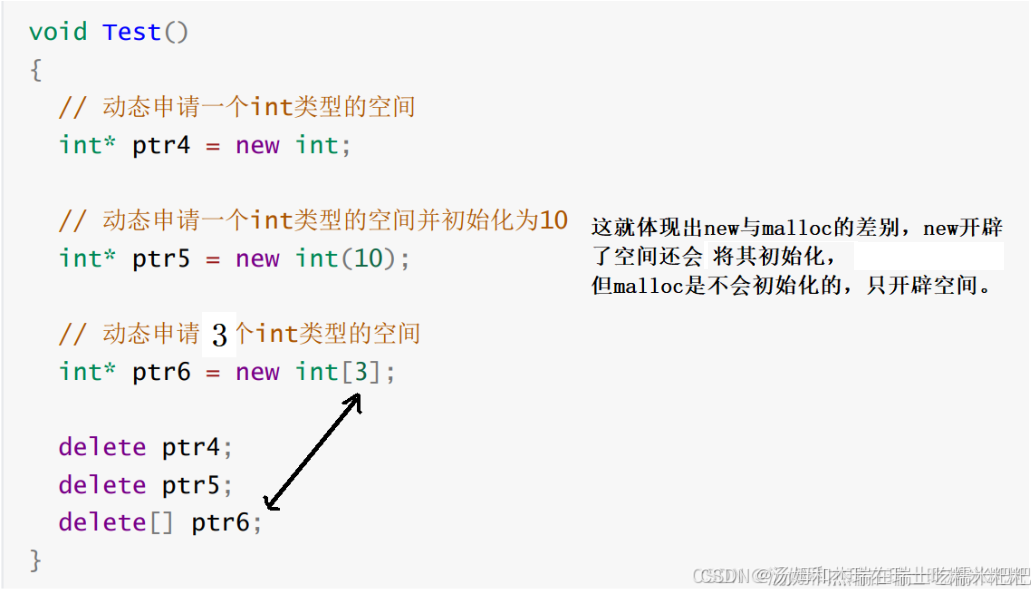 注意!!!,在申请自定义类型空间时,,new会调用构造函数,delete会调用析构函数,总而言之,new是开辟空间+初始化(无论是内置类型还是自定义类型)。