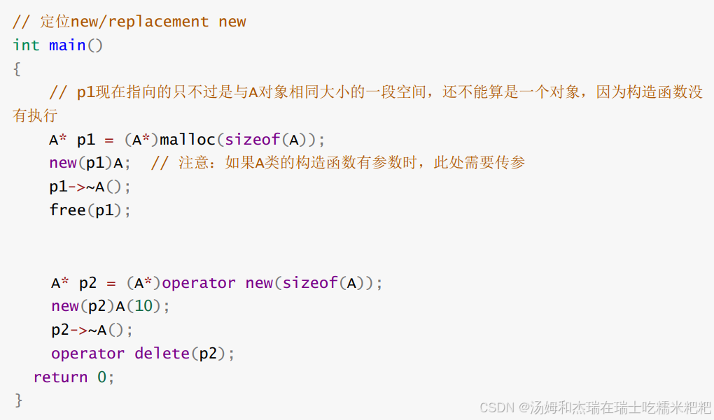 定位new表达式是在已分配的原始内存空间中调用构造函数初始化一个对象。 使用格式: new (place_address) type或者new (place_address) type(initializer-list) place_address必须是一个指针,initializer-list是类型的初始化列表 使用场景: 定位new表达式在实际中一般是配合内存池使用。因为内存池分配出的内存没有初始化,所以如 果是自定义类型的对象,需要使用new的定义表达式进行显示调构造函数进行初始化。