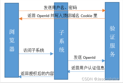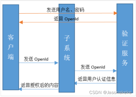 这种单点登录将用户的身份标识信息简化为OpenId存放于客户端,当用户登录某个子系统时,将OpenId传送到服务端,服务端根据OpenId构造用户验证信息,多用于C/S与B/S相结合的系统,流程如下: