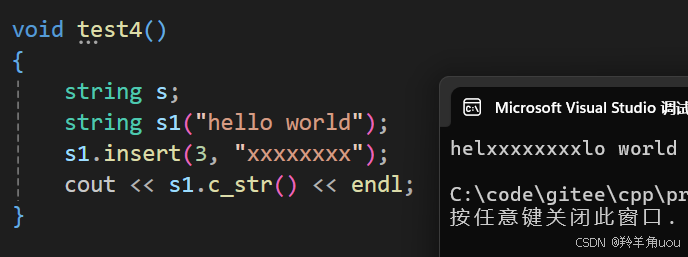 void insert(size_t pos, const char* str);//插入字符串在string.cpp中进行函数的实现。