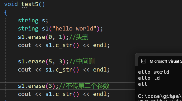 void erase(size_t pos, size_t len = npos);//删除在string.cpp中进行函数的实现。