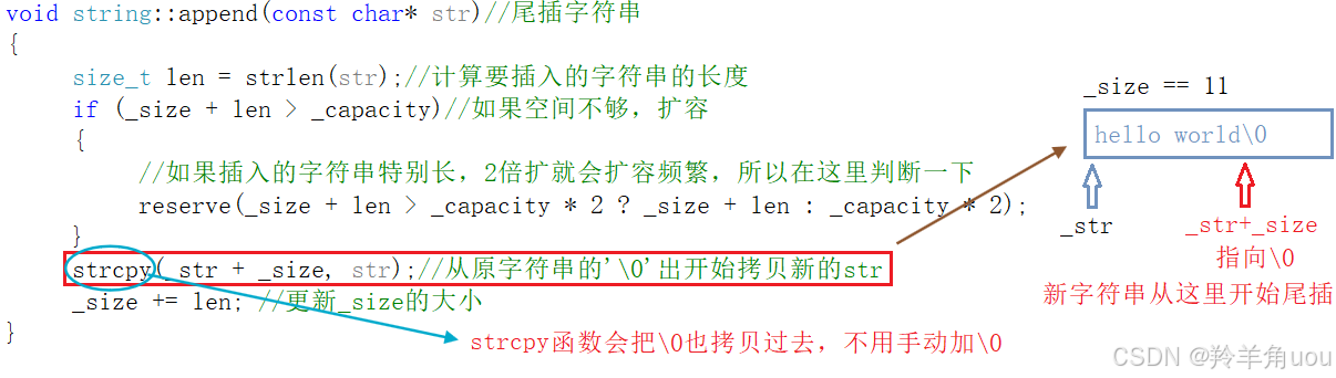 strcpy(_str + _size, str);//从原字符串的'\0'出开始拷贝新的str