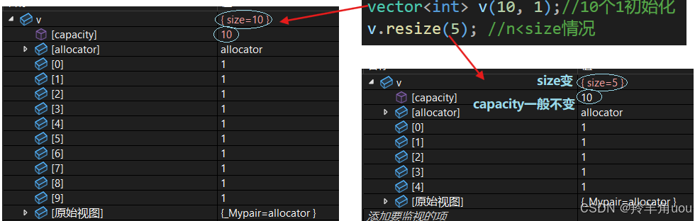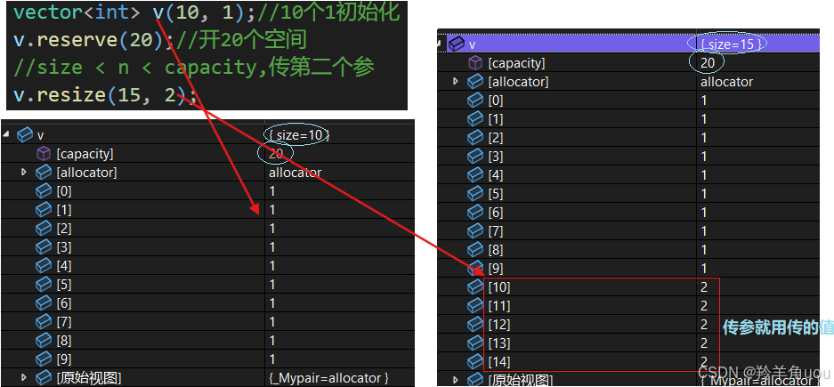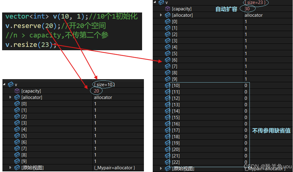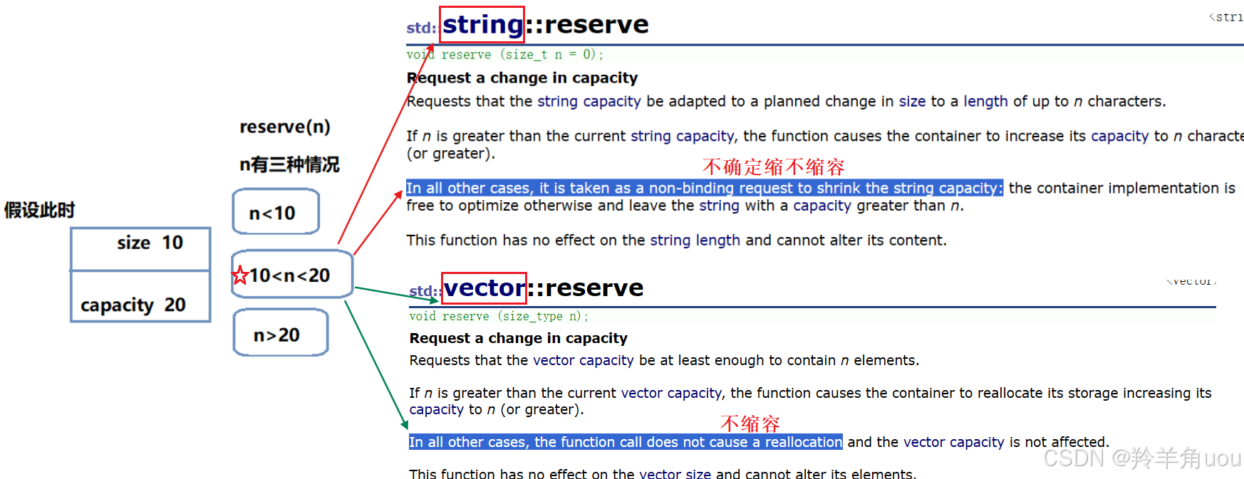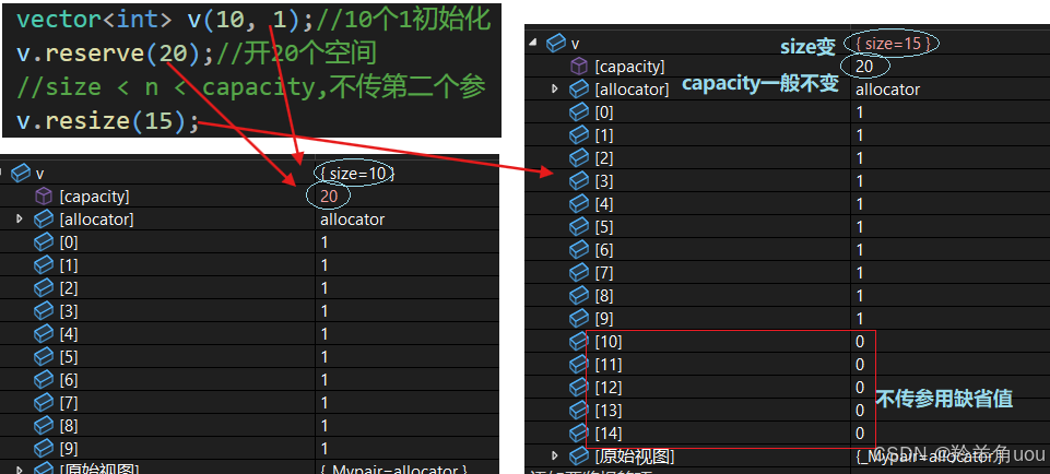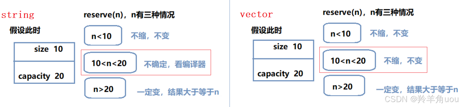 reserve是绝对不会改变size的,只会对capacity产生影响,但是resize会改变size,还会改变capacity。