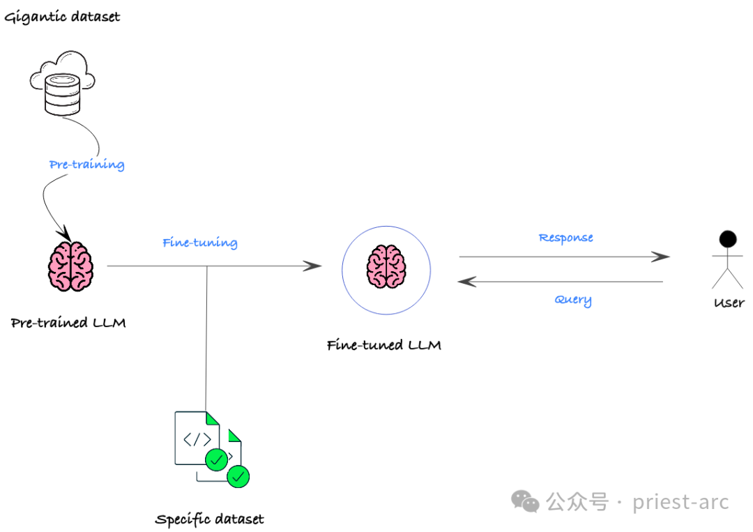 LLM 微调的核心思想是利用预训练模型的参数,将其作为新任务的起点,并通过少量特定领域或任务的数据进行“塑造”,从而使得模型尽可能快速适应新的任务或数据集。