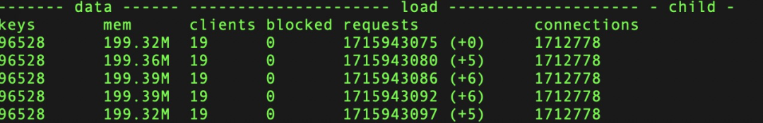 keys:当前key总数;mem:内存使用;clients:当前连接client数;blocked:阻塞数;requests:累计请求数;connections:累计连接数