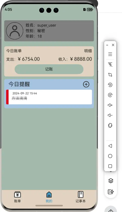 3.首页可以进行一个用户信息、今日提醒和今日账单的直观展示