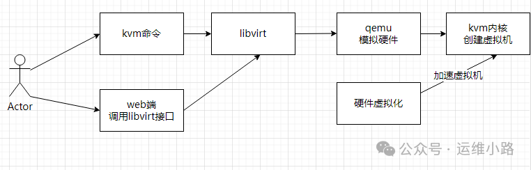 - libvirt:libvirt是一个用于管理虚拟化平台的API库,它提供了统一的接口来与不同的虚拟化软件(包括KVM)进行交互。libvirt可以通过命令行工具(如virsh)或编程接口来管理虚拟机的创建、配置、启动和关闭等操作。