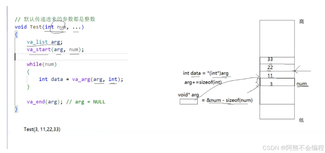 首先,可变参数列表使用的前提是参数内必须要有一项是确定的,并且这个参数需要再可变参数列表的左侧。首先,我们使用 va_start 宏来使用参数初始化结构体 va_list(实质上是一个类型为 void* 的指针),va_end 来清空va_list: