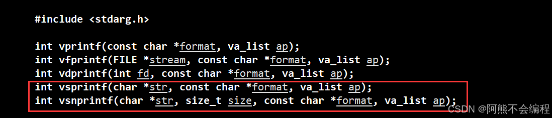 vsprintf表示,ap指针将以用户要求的 format格式 ,向字符串str中进行写入参数信息。而vsnprintf为安全模式下的输入参入信息。