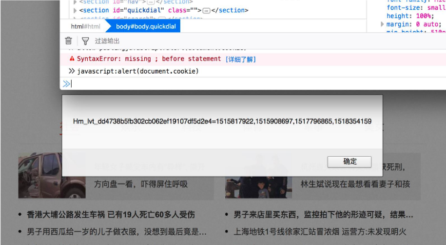 在地址栏(f12开发者工具中)输入javascript:alert(document.cookie),按下【Enter】键就会弹出当前的Cookie信息,如下图所示。