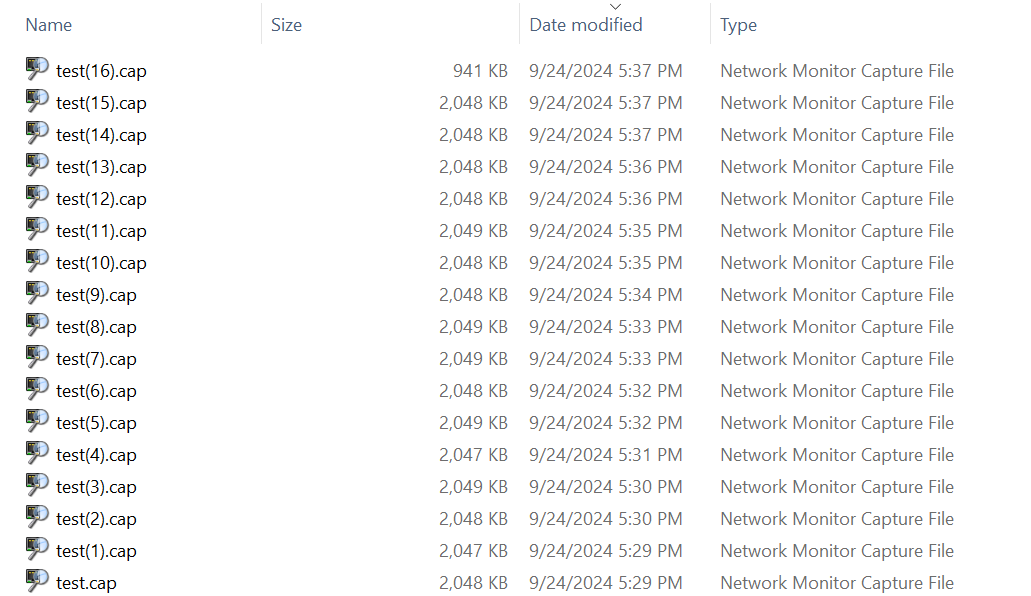 抓的包第一个是c:\test.cap,20MB一个,并不是严格的20MB,实际大小可能有一丢丢出入(最大一个500MB,可以指定),后续的是test(1).cap、test(2).cap……以此类推